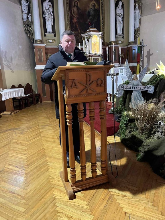 Kėdainių rajono meras Valentinas Tamulis visada mielai prisijungia prie liturginių skaitinių skaitymo. Šaulių rankose Lietuvos Trispalvių jūra.