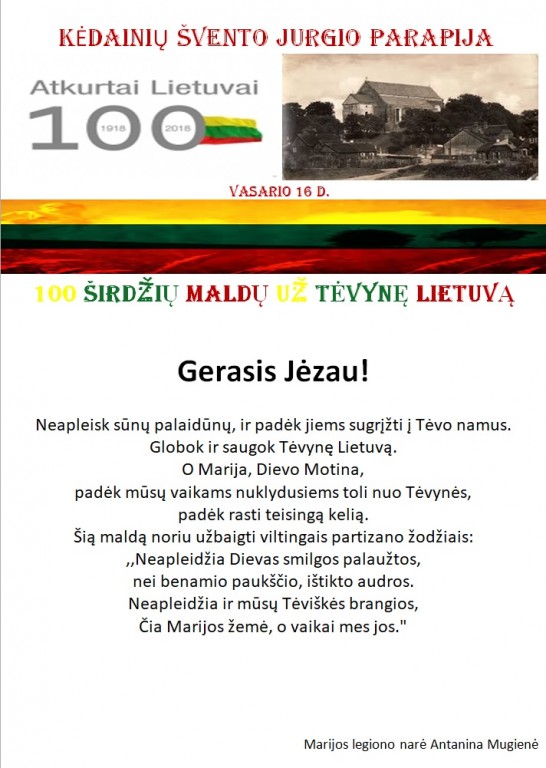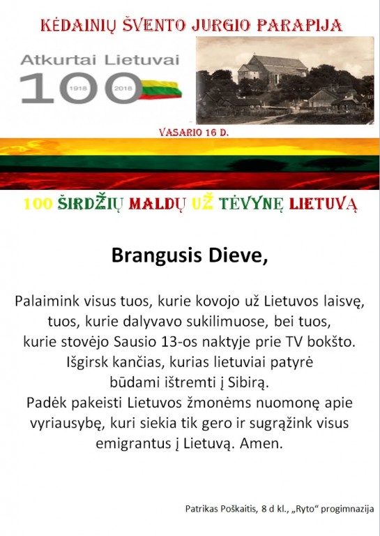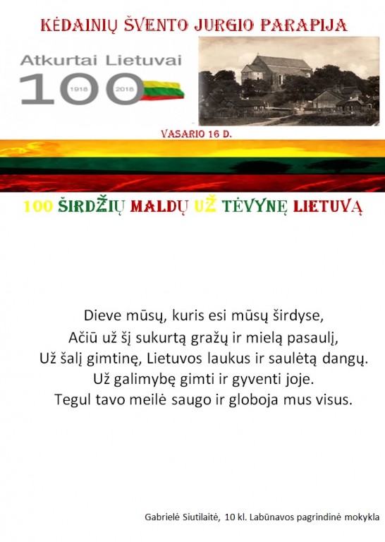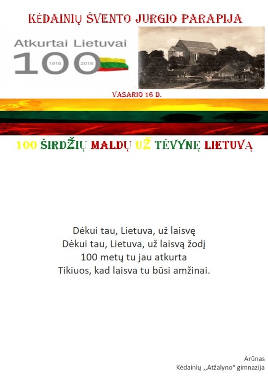 Šv. Jurgio bažnyčios tikinčiųjų bendruomenė maloniai priėmė ir įgyvendino gražią klebono Artūro Stanevičiaus iniciatyvą - laukiant Lietuvos 100 – mečio parašyti „100 širdžių maldų už Tėvynę Lietuvą“. Knygai viršelį sukūrė ir parapijai padovanojo tautodailininkė Milda Verkauskienė.