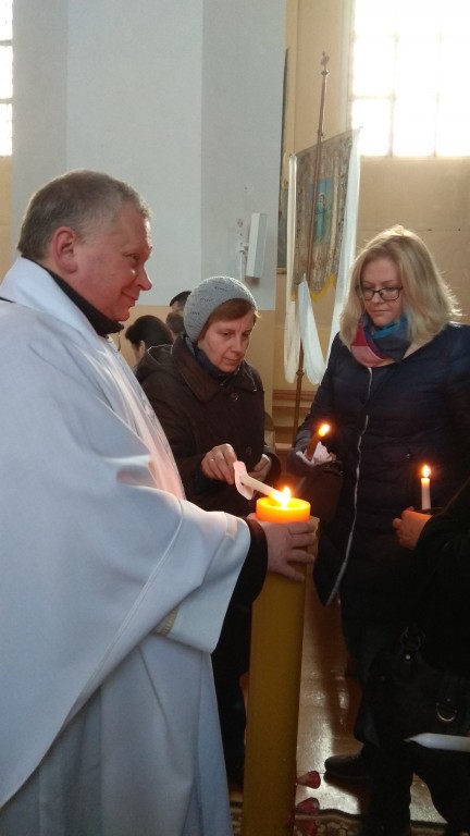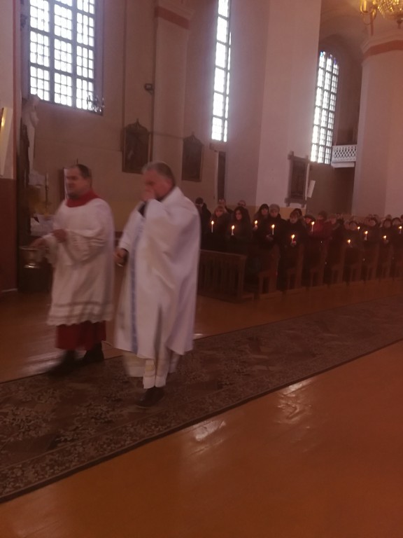 Uždegtą žvakę klebonas neša į bažnyčią giedodamas „Kristus mums šviečia“.