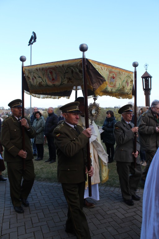 8 valandą nuvilnijo giesmė „Linksma diena jau nušvito, visi troškom džiaugsmo šito...“, kurią giedojo bažnyčios choras vadovaujamas Aušros Giedrienės. Šv. Velykų procesijos dalyviai su Švč. Sakramentu klebono Artūro Stanevičiaus rankose iškelta Monstrancija, bažnytinėmis vėliavomis patraukė aplink bažnyčią. Ėjo caritas, Povilo Lukšio kuopos šauliai, parapijiečiai, bažnyčios talkininkai, geradariai, svečiai. Pirmą kartą savo vėliavą nešė šios bažnyčios Marijos legiono legionierės ir maldos pagalbininkai. Katechezės mergaitės barstė gėles. Aplink bažnyčią giedodami giesmes apėjome tris kartus.