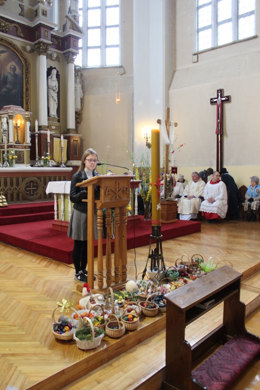 Po Šv. Mišių buvo pašventinti margučiai, kuriuos išmargintus įvairiais raštais, įvairiaspalvius, puoštus žalumynais tikintieji sudėję į krepšelius buvo sustatę prie altoriaus.