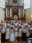 Klebonas Artūras Stanevičius sveikina vaikus, išdalina jiems Pirmosios Komunijos pažymėjimus, dėkoja katechetei ir tėvams už įdėtas pastangas. Bažnyčios choras vadovaujamas Aušros Giedrienės gieda giesmę.