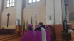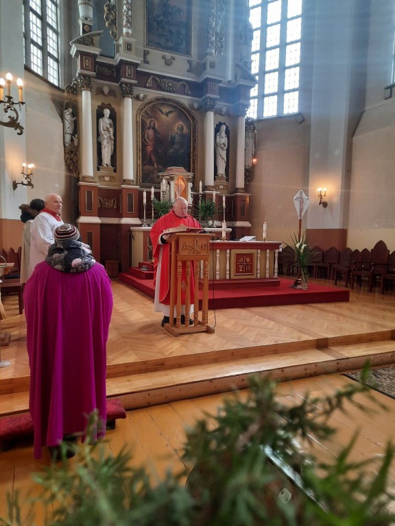 Bažnyčios Didžiajam chorui vadovaujamas Gintarės Brazinskienės giedant giesmę „Kristau, Tu – Garbės Karalius“, buvo einama iškilminga procesija.